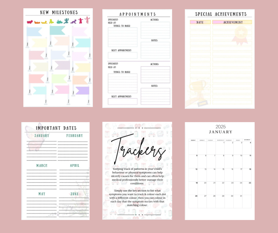 This is the Ultimate SEND Parenting Planner for 2025, best suited to children with more complex needs with extra pages for more appointments, medication records, a range of tracking pages for different conditions such as seizures, sleep, bowel movements, extra contacts page, respite details, medical supply record, mickey button changing record plus all the pages contained in the lite planner.