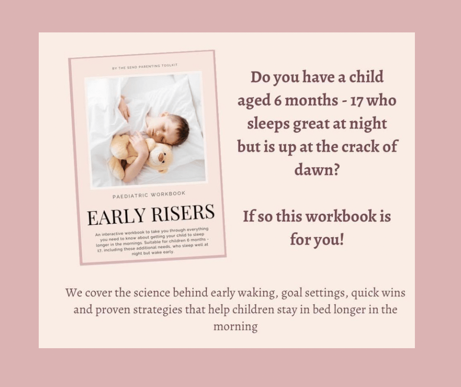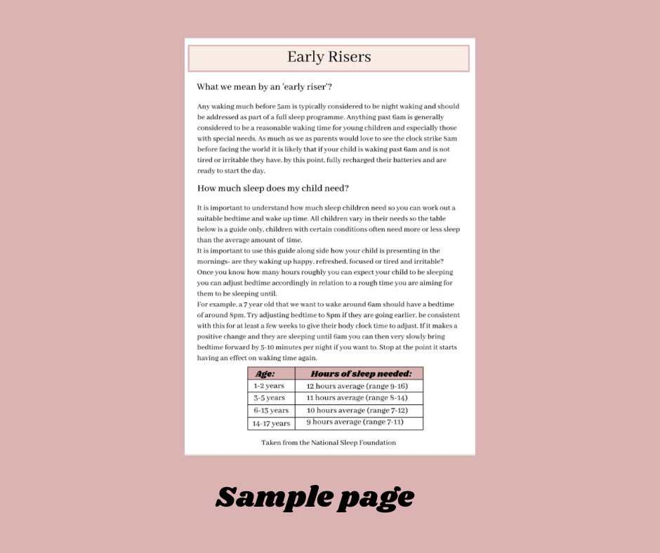 This 23 page workbook is designed to get you really thinking about the ways you tackle early rising with lots of pages to fill out, how to keep a sleep diary and analyse it, how to make a plan and lots of suggestions to try. It also includes 3 pages of visual aids to use with your child so you can get started straight with the strategies I suggest in it.